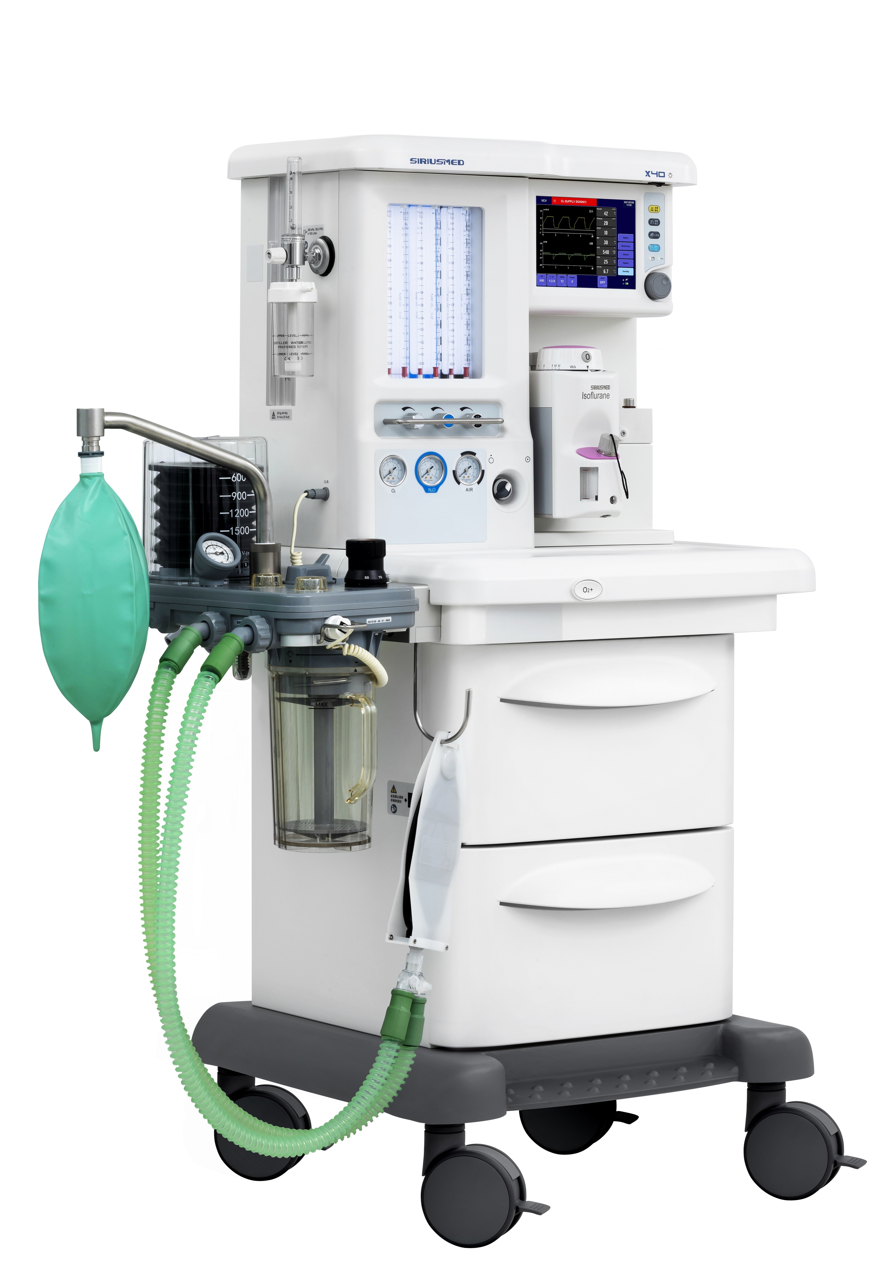 独特な設計されていた可変的な開口部の流れセンサー8.4"作動すること容易なタッチ画面制御を用いるTFT LCD潮容積の設定:50 | 1500ml (任意20 | 1500ml)気学的に運転される電子的に制御された、作り付け電池多波形の表示:P-T、F-T、V-Tの肺機械工のループ正確な電子のぞき見弁O2港が付いている補助流量計統合された二酸化炭素の吸収物cir