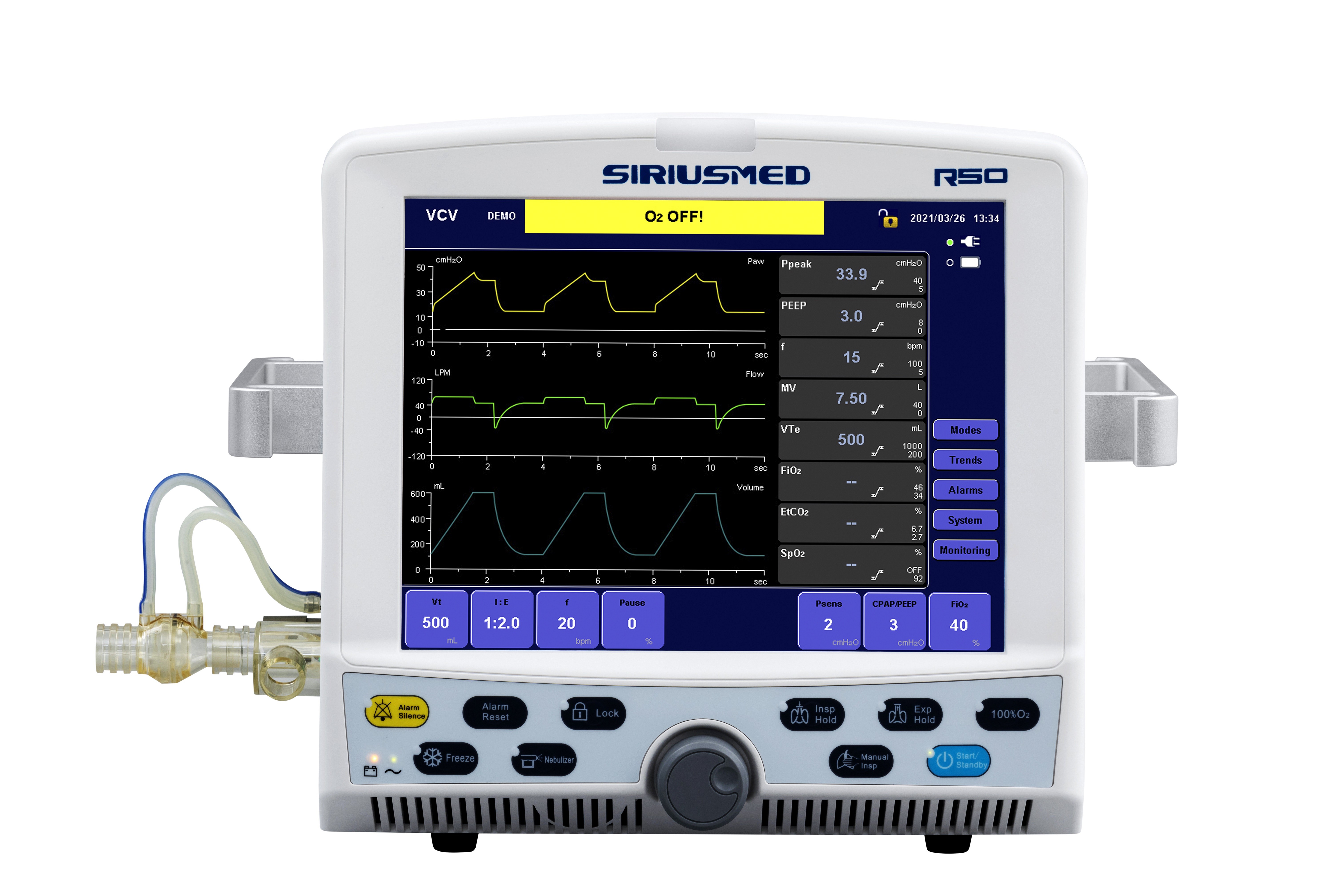 潮容積 分時拍出量 酸素濃度 航空路圧力 呼吸の頻度 ETCO2 脈拍数 回路の閉塞 無呼吸警報 O2供給の羽毛警報 本管の失敗警報 電池の低い警報 電池によって排出される警報 警報沈黙 |