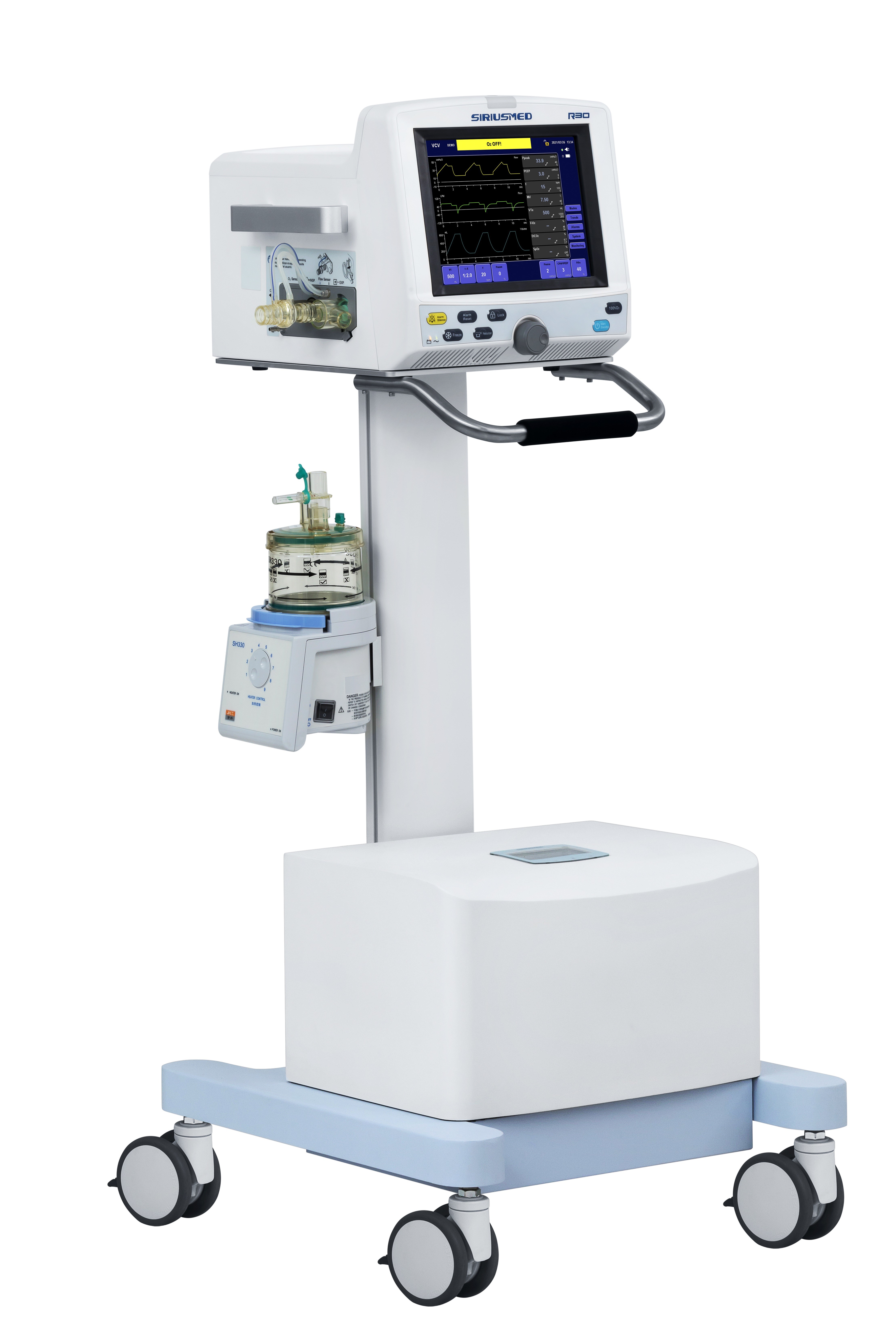 l 10.4」、タッチ画面が付いているTFTの表示、 l VCV、PCV、SIMV-VC、SIMV-P、バックアップCPAP/PSV (任意:Duophasic/APRV、NIV) l P-T、F-T、V-T (任意:二酸化炭素時間、pulserate時間) lループ:P-V、F-V l NI-MH電池、>120mins l RS232、VGA、USBのリモート・アラーム